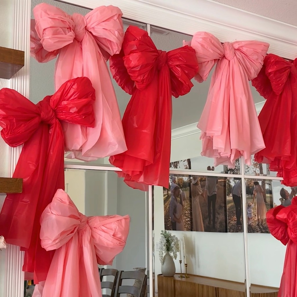 DIY Valentine’s Day decor does not have to be expensive or complicated, and this is one of my favorite must have ideas every single year. Using plastic table covers to create giant bows is such a simple trick, but the result looks surprisingly high end! The first time I tried this, I was honestly shocked by how dramatic it looked once taped to the wall. I grabbed a few pink and red table covers, tied them into oversized bows, and suddenly my plain wall looked like a festive photo backdrop. It took me less than an hour and immediately set the Valentine’s mood!